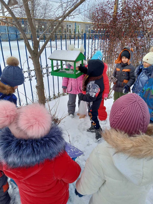 Эколята группы "Солнышко" продолжают заботиться о зимующих птицах. Зимняя столовая для пернатых регулярно работает, кормушки не остаются пустыми. У разных птиц есть свои предпочтения. Воробьи и голуби любят хлебные крошки, пшено, мелко нарубленное вареное яйцо. Синицы предпочитают несоленое сало, сыр, мясо (вареное и сырое) и семена подсолнуха. Кусочки сала и мяса в специальной кормушке не нуждаются. Их нужно просто повесить на ветку или любую перекладину на такую высоту, чтобы не достали кошки и собаки. Чем разнообразнее будет угощение в кормушке, тем больше разных птиц прилетит в «столовую».