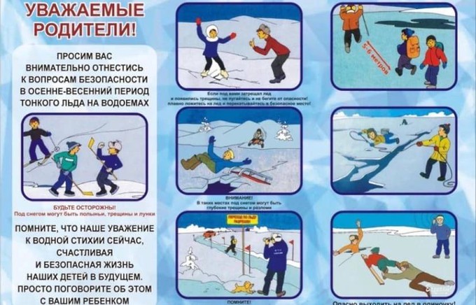 * ЗАПРЕЩАЕТСЯ: выходить на лед в состоянии алкогольного опьянения, прыгать и бегать по льду, собираться большим количеством людей в одной точке, выходить на тонкий лед, который образовался на реках с быстрым течением.