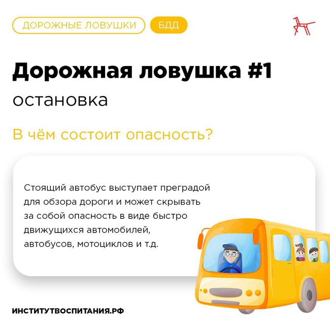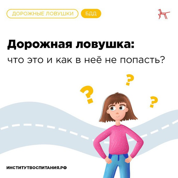 Дорожная ловушка – это ситуация обманчивой безопасности. Например, когда опасность скрыта от пешехода за кустами, деревьями, забором, сугробом, стоящими и движущимися автомобилями, другими пешеходами. Обзору также могут мешать повороты, спуски и подъёмы самой дороги. Центр по профилактике детского дорожно-транспортного травматизма Института Воспитания (https://t.me/institut_vospitaniya) запускает серию постов про дорожные ловушки.